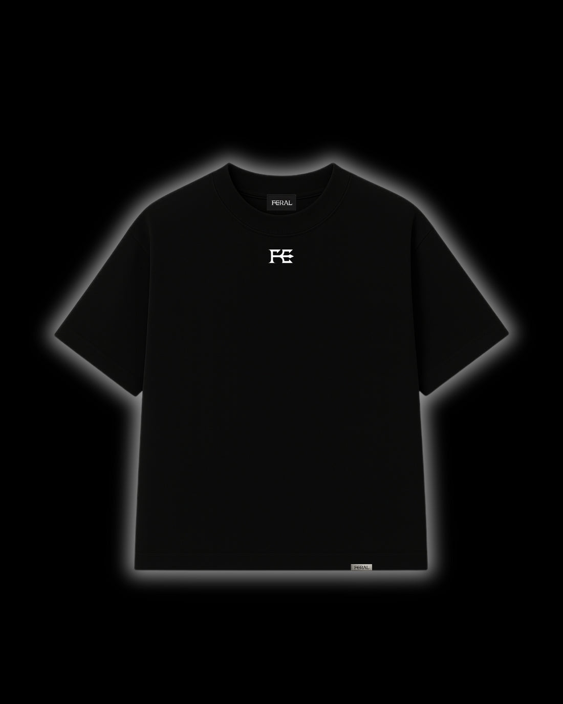 Kurzärmliges Jersey-T-Shirt in tiefem Schwarz. Übergroße Passform aus mittelschwerer Baumwolle. Gerippter Rundhalskragen. FE-Symbolgrafik auf der Rückseite und Feral-Marke auf der Brust.