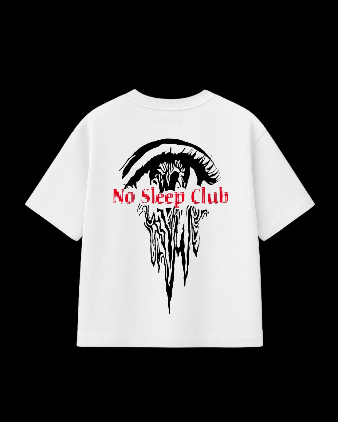 Short-sleeve jersey t-shirt in white. Oversized boxy fit. Ribbed crewneck collar and Feral logo embroidery. Showcases hand-drawn No Sleep design across the back and Feral logo on the front