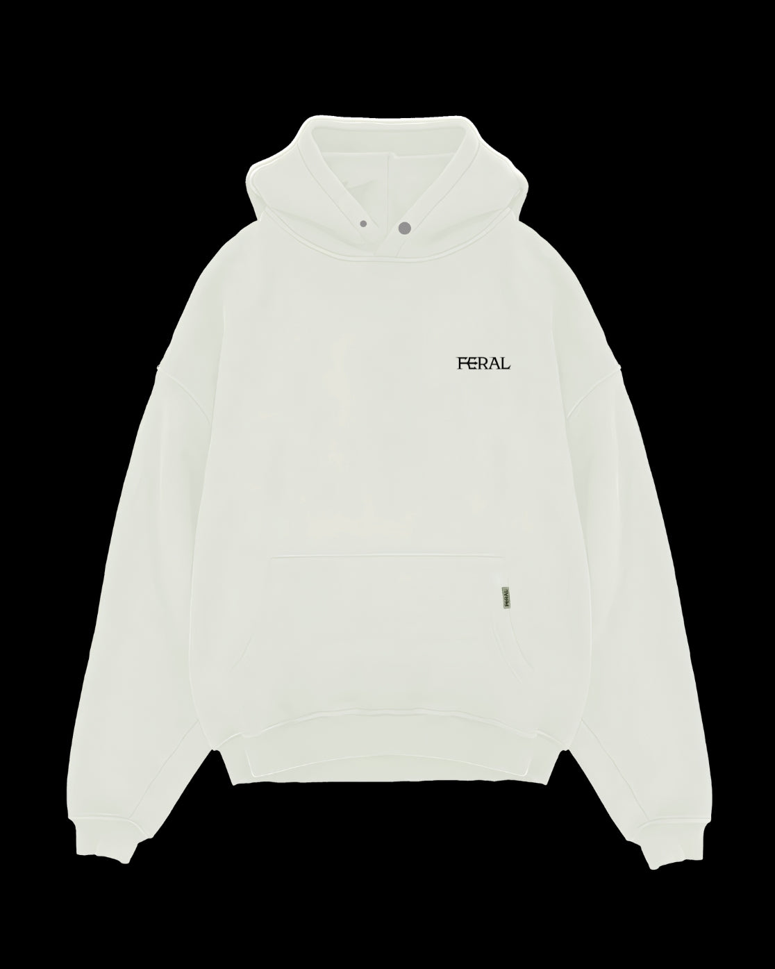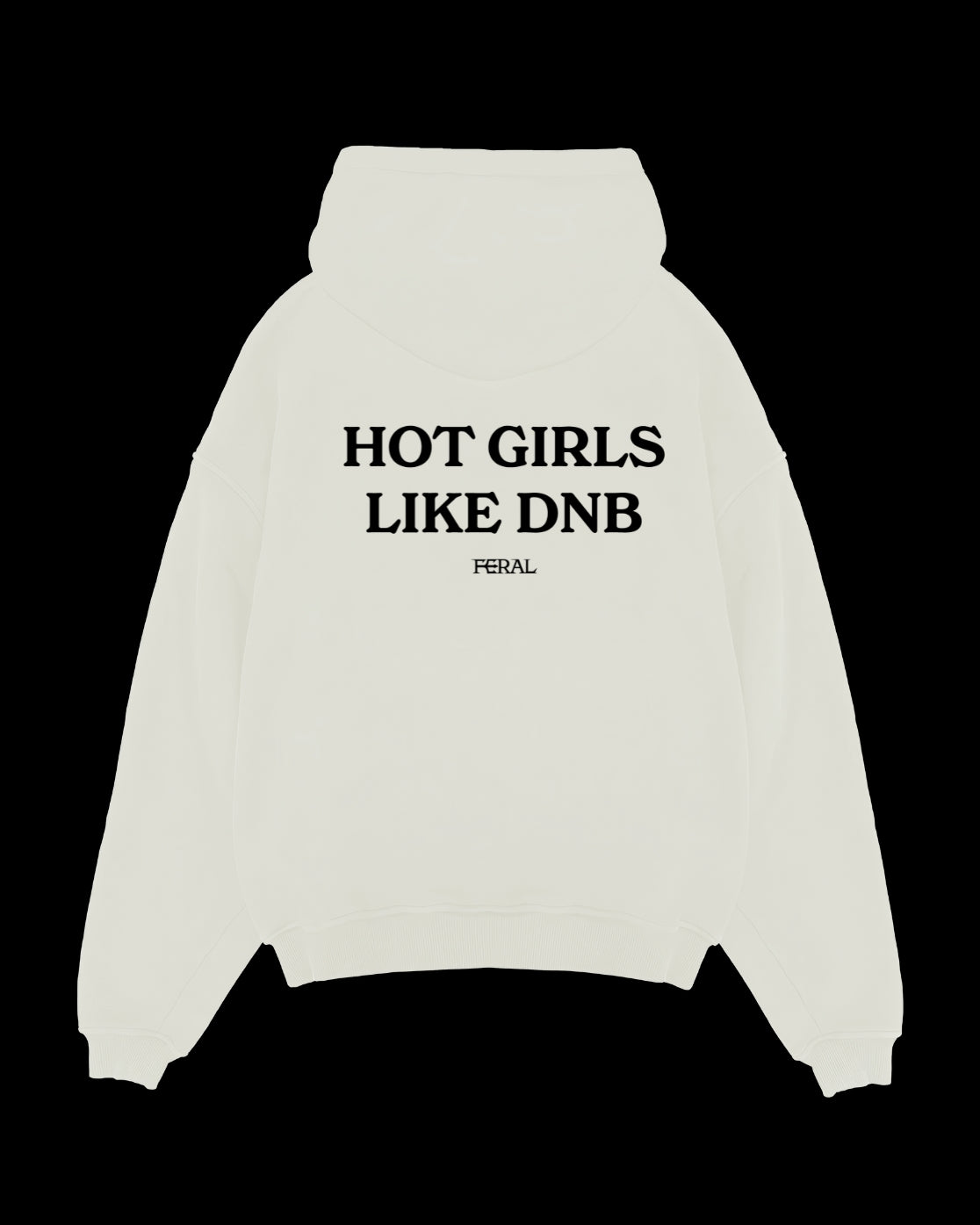 Feral hoodie features an oversized fit and is crafted from ultra-soft, heavyweight french terry cotton for lasting quality. It comes with ribbed hems and cuffs, along with FERAL LOGO on chest and HOT GIRLS LIKE DNB on back. The Cobrax snap button adds a unique touch.