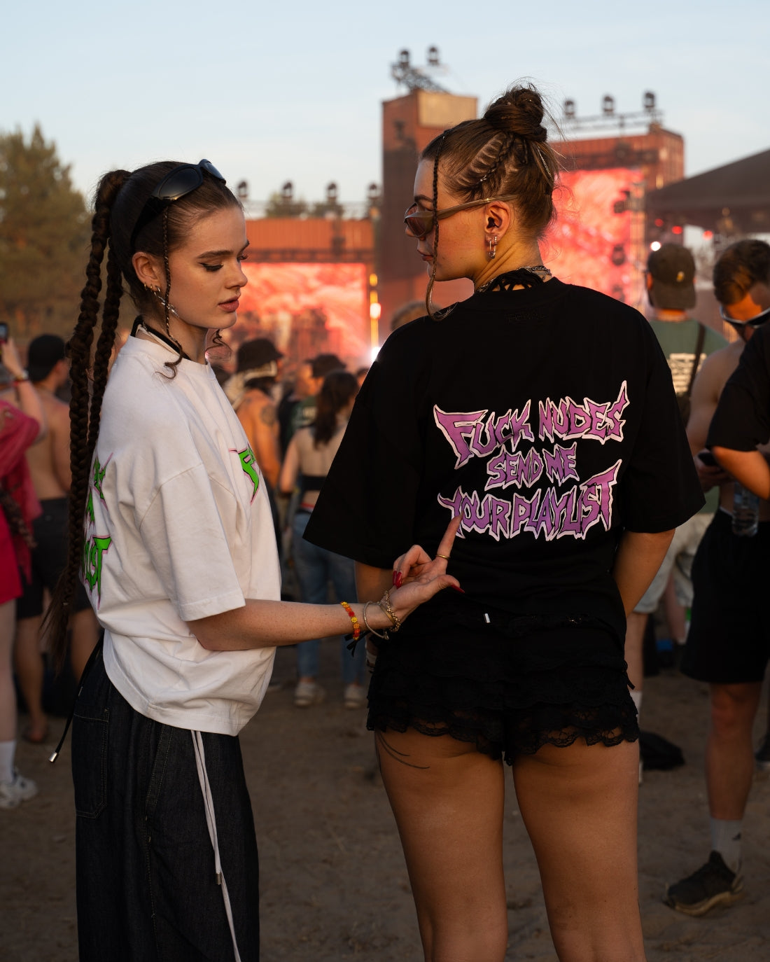 Premium 240gsm luxury black cotton tee featuring the original viral slogan "FUCK NUDES SEND ME YOUR PLAYLIST" on the back and matching FERAL logo on front. Unisex fit, rave-ready.